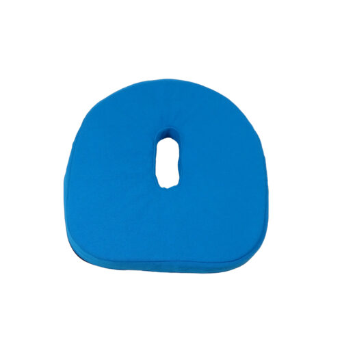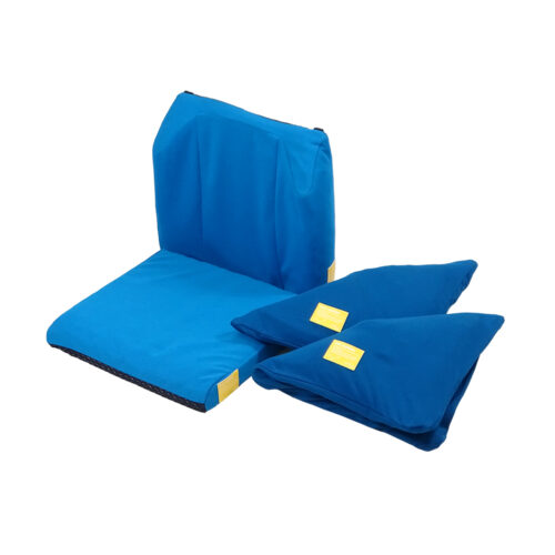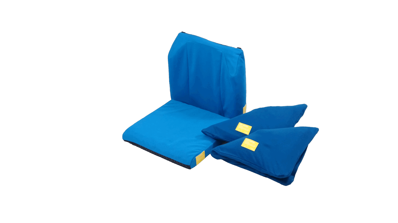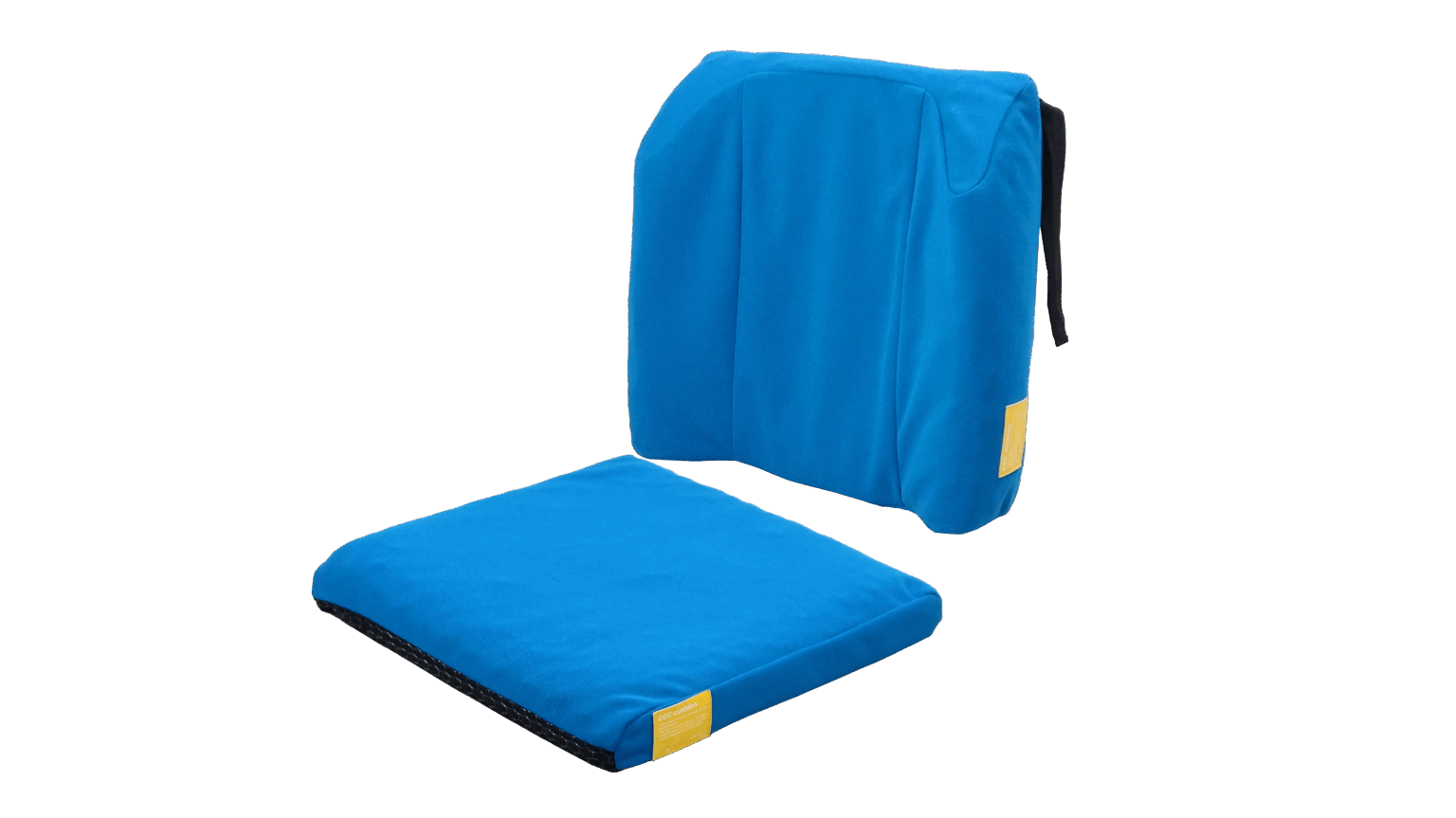 車いす介護に最適なクッションの標準セット。せなかクッションには上部に取り付け用の紐が付いているので、車いすに紐を結び固定できます。おしりクッションは裏面に滑り止め加工を採用しました。
