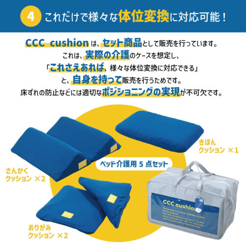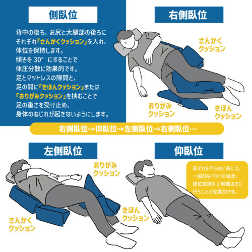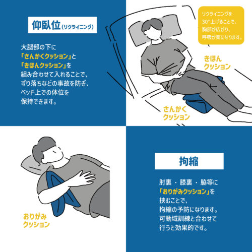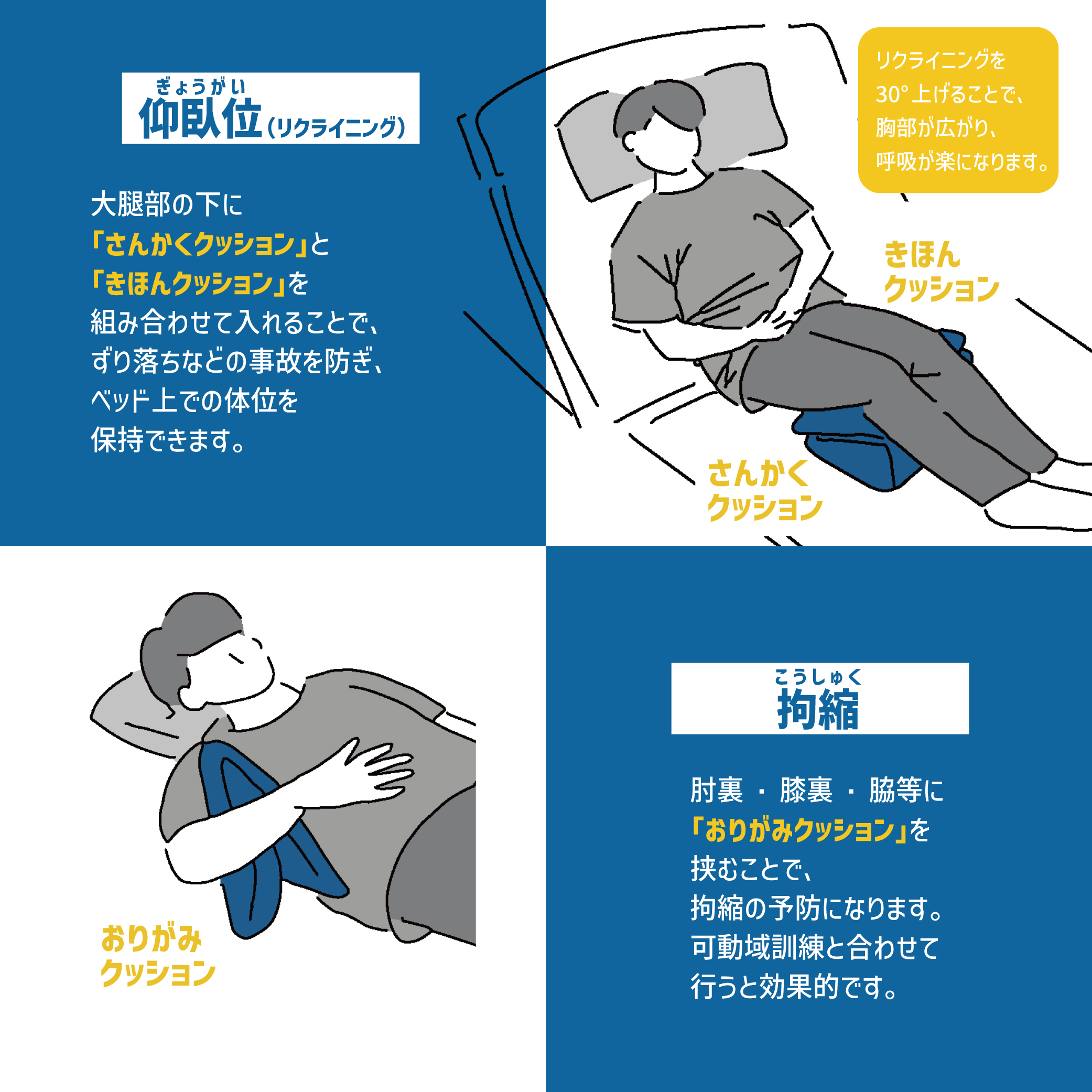 このセットで、側臥位・リクライニング使用時の仰臥位・拘縮・おむつ交換・足挙上といった、